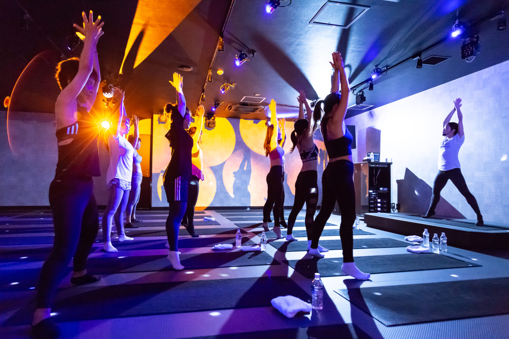 暗闇にきらびやかな照明という非日常空間でのトレーニングは、ストレス解消にも効果的。